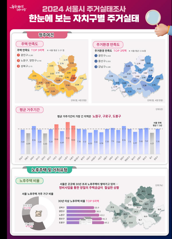 시는 국토교통부 주거실태조사 서울 표본(약 7000가구), 서울시 자체 표본(약 8000가구) 등 1만5000가구를 대상으로 조사를 실시했다. 표본 확대와 특화 문항 추가로 자치구 단위 주거여건과 주거수요를 분석했다.