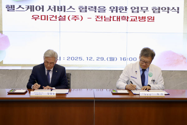 우미건설은 29일 김영길 우미건설 사장과 정신 전남대 병원장이 참석한 가운데 전남대학교병원과 ‘지역사회 건강 증진과 의료 접근성 향상을 위한 헬스케어 서비스 모델 도입’ 업무협약(MOU)을 맺었다고 30일 밝혔다.