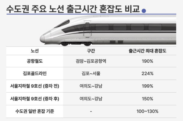 열차 혼잡도는 열차 정원 대비 실제 승차 인원의 비율로, 혼잡도가 150%를 넘으면 열차 내 이동이 불가하고 심지어는 서로 어깨가 밀착된다. 170%이상은 팔을 들 수 없는 수준이다. 공항철도에 따르면 출근시간 내 계양~김포공항역 구간의 최대 혼잡도는 190% 수준으로, ‘지옥철’로 불리는 김포골드라인, 증차 이전 서울 9호선과 맞먹는 수치를 보인다.