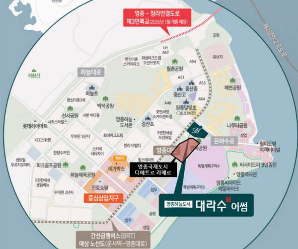 더불어 단지와 방죽공원을 사이에 두고 남서쪽에 조성될 ‘영종국제도시 디에트르 라메르’ 역시 조망권에 악영향을 줄 수 있는 요소로 꼽힌다. 이 단지는 지하 3층~지상 49층, 8개 동, 총 1009가구 규모 주상복합 단지로 건설될 예정이다. 가구 규모만 놓고 보면 ‘영종하늘도시 대라수 어썸’ 보다 세 배 이상 크다.