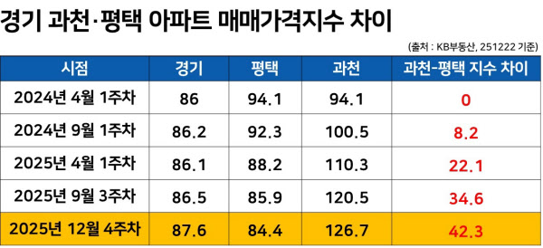 그러나 4월 3주차부터 분위기가 급변했다. 평택이 94.0으로 하락하는 사이, 과천은 94.4로 상승했고, 87주 연속 하락과 상승이라는 결과를 맞닥뜨렸다. 12월4주차 기준, 평택 누적하락률은 10%, 과천 누적상승률은 32.6%다.