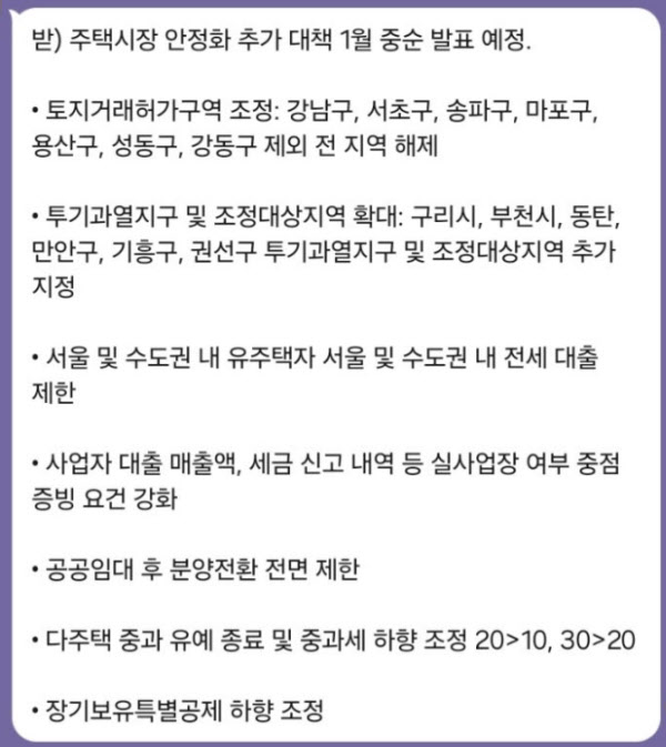 [땅집고] 정부의 1월 부동산 대책을 둘러싸고 시장에 각종 ‘지라시’가 돌고 있다. 아직 정부가 공식적으로 밝힌 내용은 없지만, 다주택자 세금 규제 강화, 토지거래허가구역 해제, 투기과열지구 확대 등이 주요 키워드로 거론된다. 그동안 지라시 내용들이 대책에 포함된 적이 많아 상당수 시장 참여자들은 사실로 받아들이고 있다. 국토교통부는 이달 중 부동산 시장 안정화를 위한 새로운 공급 대책을 발표할 예정이다.