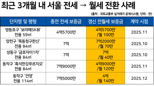 보증금이 같지만, 월세 100만원이 붙은 경우도 있다. 영등포구 신길동 ‘보라매SK뷰’ 전용 59㎡ 임차인은 보증금 4억5700만원을 유지하면서 월세 100만원을 추가로 내기로 했다.