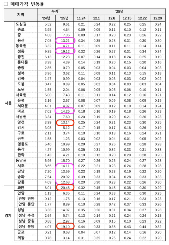 다만 정부가 서울 강남·서초·송파·마포·용산·성동·강동구 총 7개구만을 토지거래허가제로 남겨두기에는 논리적 명분이 부족하다는 지적이 나온다. 한국부동산원 자료 중 2025년 한 해 동안 누적 매매 상승률을 보면 서울 강동구는 집값이 12.63% 오르면서 7개구 중 최저치를 기록했다. 하지만 서울 양천구는 13.14% 상승률을 보였고, 경기권에선 분당이 19.10%, 과천이 20.46% 올라 강동구보다 상승폭이 더 컸다. 즉 상승률을 기준으로 정부의 토지거래허가구역 적용 여부를 예측하는 것은 맞지 않다는 설명이다.