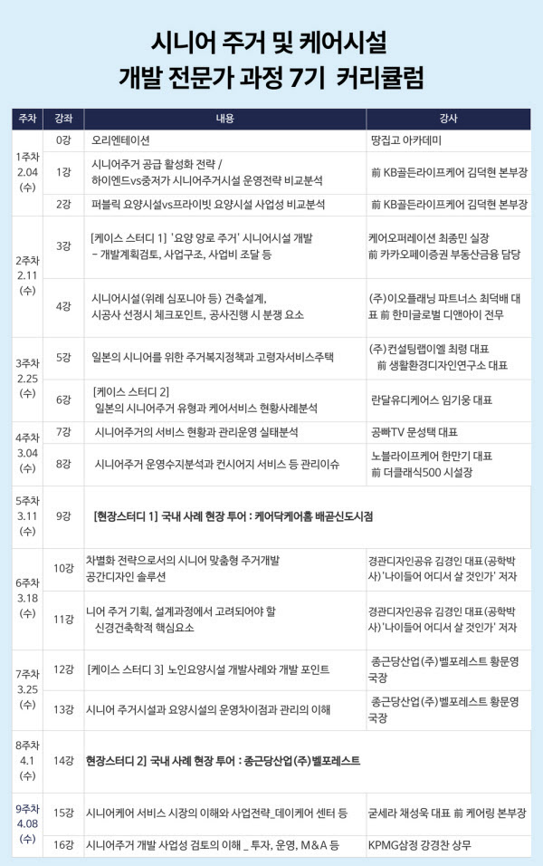 땅집고가 최근 늘어나는 시니어 부동산 개발 니즈에 맞춰 ‘노인복지주택 관리 및 운영 전문가과정(7기)’을 2월 개강한다. 시니어주거·케어시설을 부동산 투자 개발 관점에서 짚어보고 방향성과 전략, 운영관리의 중요성까지 다루는 실전형 과정이다.