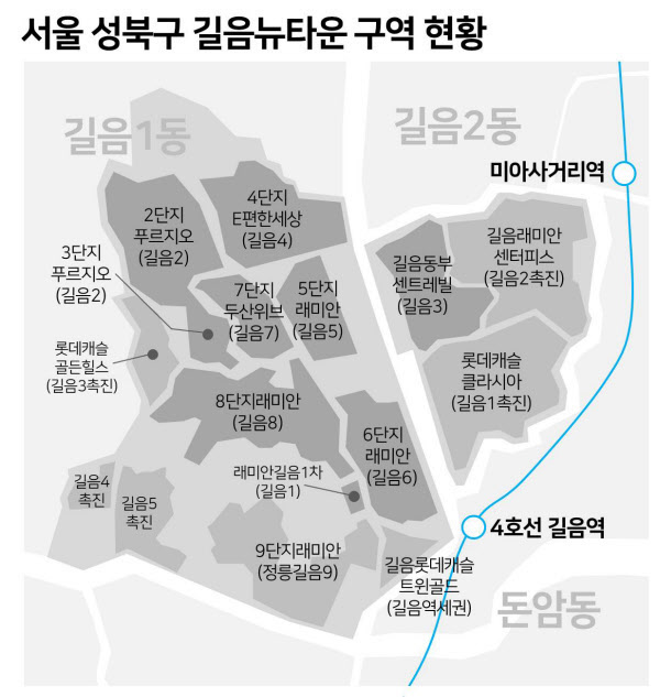 길음뉴타운은 성북구 길음동 일대 재개발 주거지역으로, 4호선 길음역 인근이다. 재개발 이전까지는 노후 주택이 밀집한 일명 ‘달동네’였다. 2000년대 뉴타운 열풍이 불었을 당시 왕십리, 은평과 함께 시범지역으로 선정된 곳이다. 그 중에서도 길음뉴타운은 사업 속도가 가장 빨랐다.