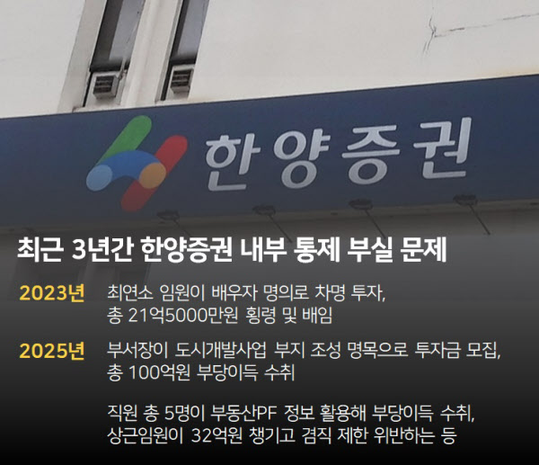 2023년에는 한양증권이 세운 최연소 임원이 20억원대 횡령·배임 혐의에 휩싸인 사건도 있었다. 부동산PF 부문에서 활약하던 1982년 E씨는 2022년 연봉으로 28억원 등을 챙기며 대표이사(7억4000만원)보다 더 높은 급여를 받는 사내 핵심 인물로 통했다. 하지만 금융감독원 수시 검사 결과 E씨가 배우자 명의로 차명 투자하면서 21억5000만원 상당을 챙긴 것으로 확인됐다. 한양증권은 해당 문제를 공시하고 고발을 진행했다.