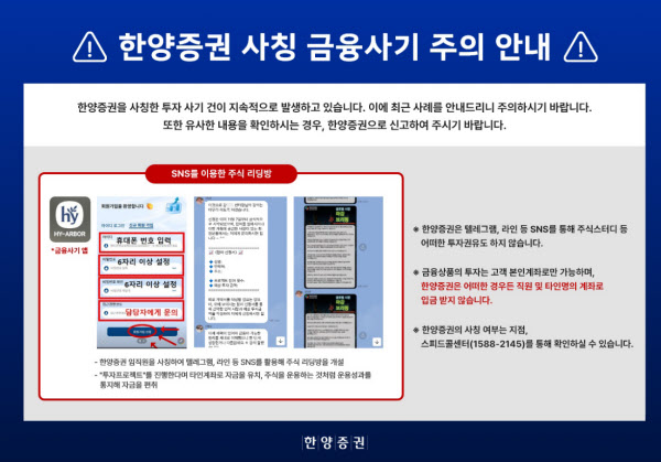 지난해 2월 한양증권 직원 한 명이 투자자를 속여 100억원대 사기를 벌인 사실이 뒤늦게 드러났다. 조사에 따르면 부서장이었던 D씨는 경기 용인시 일대에 한양증권이 보증하는 도시개발사업이 있다면서 부지 조성에 필요한 자금을 모집했다. 이 과정에서 D씨는 회사 인감을 위조해 투자약정서 등 문서를 만들었다. 피해자는 50억원씩 총 두 번에 나눠 모두 100억원을 D씨에게 송금한 것으로 확인됐다.