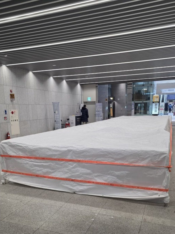 [땅집고] 신축 건물 내에 마치 초대형 침대 같은 물체가 있는 사진이 연일 화제가 되고 있다. 사람이 눕는 매트리스라고 하기에는 지나치게 크다. 설명 문구 등 어떠한 표식 없이 무언가를 가린 듯한 모양새다.
