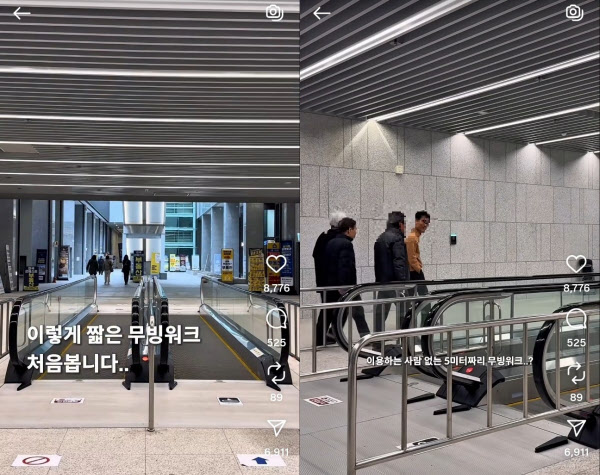 인스타그램 릴스에 등장한 “이렇게 짧은 무빙워크 처음 봅니다”라는 글은 조회수 208만회를 기록하는 등 많은 관심을 받았다. 작성자는 “서울시 사업 인가 조건에 ‘무빙워크 설치’가 있었는데, 길이를 명시하지 않아 5m 무빙워크가 생겼다”며 “이용하는 이가 드물고, 구청에 민원이 들어오는 상황”이라고 했다.