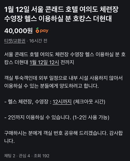 서울 영등포구 여의도에 있는 5성급 호텔 ‘콘래드 서울’ 투숙객이라고 밝힌 글쓴이 A씨는 “외부 일정으로 내부 시설을 사용하지 않아 이용하실 수 있는 분들에게 양도하려고 한다”면서 “헬스장과 수영장은 체크아웃 시간인 12시까지 이용 가능하고, 2인까지 이용할 수 있다. 구매하시는 분에게 객실 번호를 공유해드리겠다”고 했다.