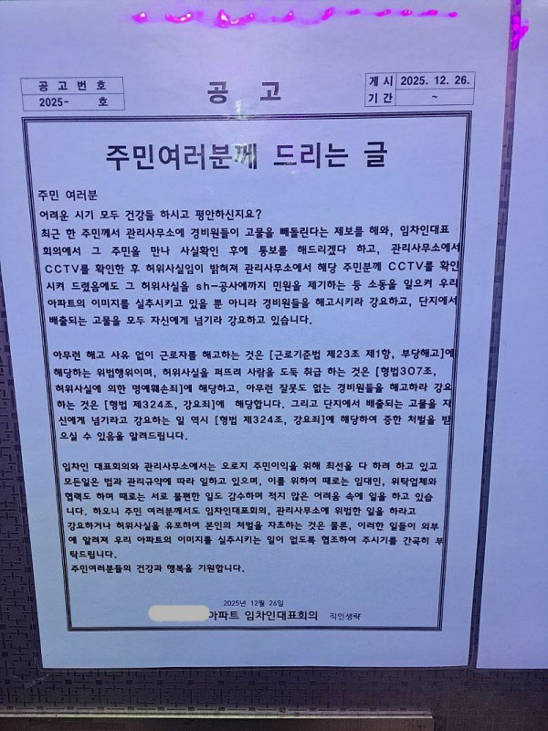 이들은 안내문을 통해 “주민 여러분께서도 임차인대표회와 관리사무소에 위법한 일을 하라고 강요하거나 허위사실을 유포해 본인의 처벌을 자초하는 것은 물론, 이러한 일이 외부로 알려져 아파트 이미지를 실추하는 일이없도록 협조해주길 부탁드린다”고 당부했다.