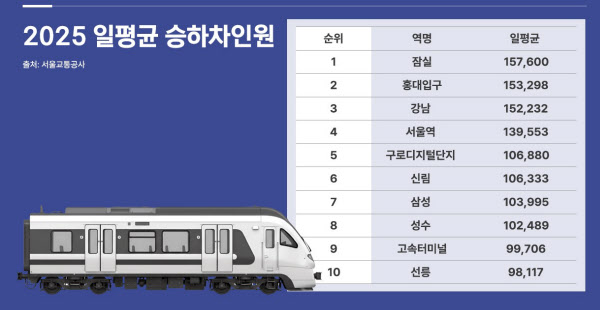 서울교통공사가 집계한 2025년 서울 지하철 1~8호선 승하차 인원 통계에 따르면, 2호선 잠실역의 하루 평균 승하차 인원은 15만7600명으로 조사됐다. 전년(15만6177명)보다 이용객이 더 늘어나며 1위 수성에 성공했다.
