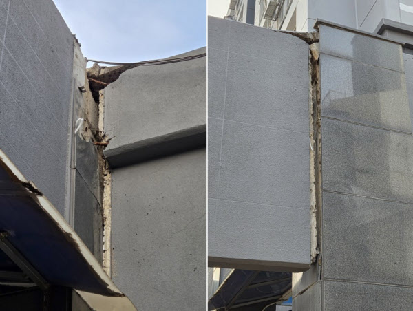 18일 연합뉴스에 따르면 서구 가정동 한 아파트는 저층부의 원기둥 형태 장식용 구조물과 연결 부위에 균열이 다수 생긴 상황이다. 일부 부위는 콘크리트 단면과 철근이 고스란히 드러났다.