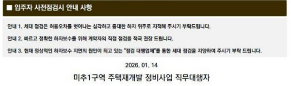 안내문에는 모든 하자를 접수하기보다는 ‘심각하고 중대한 하자’ 위주로 지적해 달라는 요청도 포함됐다. 전문 점검업체 동반을 지양하는 이유로는 “실적을 위해 과도한 하자 지적이 나올 수 있다”는 설명이 덧붙여졌다. 이에 대해 한 주택업계 관계자는 “사전점검은 입주자가 시공사와 사실상 대등한 위치에서 하자를 확인할 수 있는 유일한 기회”라며 “전문업체를 배제하려는 방식은 소비자 권리를 제한하는 것으로 비칠 수 있다”고 말했다.