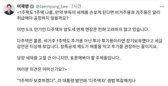 23일 이 대통령은 본인이 직접 운영하는 SNS(소셜미디어)에 “1주택도 1주택 나름, 만약 부득이 세제를 손보게 된다면 비거주용과 거주용은 달리 취급해야 공정하지 않나”라며 “이번 5·9 만기인 다주택자 양도세 면제 연장은 전혀 고려하지 않고 있다”는 글을 게시했다.
