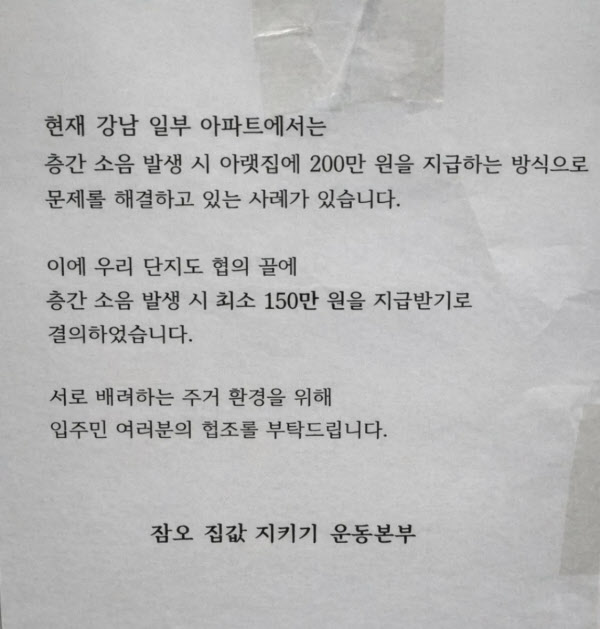 게시글에선 “현재 강남 일부 아파트에서는 층간 소음 발생 시 아랫집에 200만원을 지급하는 방식으로 문제를 해결하고 있는 사례가 있다”면서 “이에 우리 단지도 협의 골에 층간 소음 발생 시 최소 150만원을 지급받기로 결의하였다”는 문구가 기재돼있다. 이어 “서로 배려하는 주거 환경을 위해 입주민 여러분의 협조를 부탁드린다”며 글을 마쳤다.