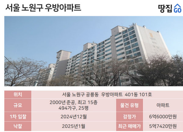 땅집고옥션(▶바로가기)에 따르면 해당 물건은 서울 노원구 공릉동 우방아파트 1층 전용면적 84.9㎡(25.7평)으로 2024년 12월 첫 경매에 나왔다. 최초 감정가는 6억6000만원이었다. 이 아파트는 2000년 준공한 입주 25년차 낡은 아파트로 총 5개 동 494가구다.