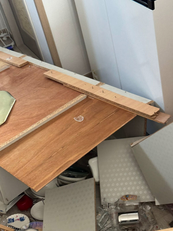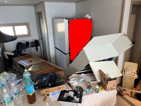 작성자 A씨가 첨부한 사진을 보면 싱크대 상부장이 통째로 벽에서 떨어져 뒷면이 위를 향해 있었다. 상부장 뒷면에는 합판과 뾰족한 못, 전선 등이 그대로 남아 있다. 상부장이 떨어지면서 냉장고 옆 수납장도 완전히 박살이 났다. 당시 상황을 보여주듯 바닥을 향해 기울어져 있고, 가장 윗부분은 아예 수납장에서 분리됐다.