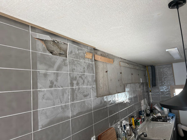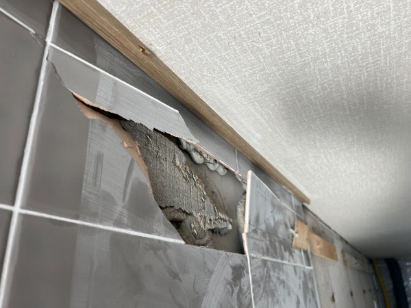 상부장이 붙어있던 자리 역시 보수가 불가피해 보인다. 완전히 깨진 벽타일 뒤로 회색 시멘트가 고스란히 노출돼 있다. 벽에 붙은 목재 역시 언제 떨어질지 모르는 실정이다.