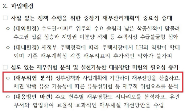 자세히 보면 그간 지난해 배경으로 언급했던 ‘선제적 재무리스크 발견 및 전망 정합성 제고’ ‘정부정책 수행을 위한 공사 재무적 체질 개선 선도’와 달리, 새로운 내용이 기재돼 눈길을 끈다.