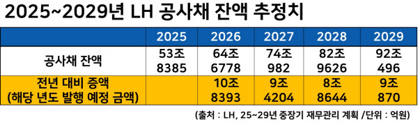 LH의 공사채 잔액은 매년 눈덩이처럼 불어날 전망이다. LH는 ‘2025~2029 중장기 재무관리계획’에서 올해 말 공사채 잔액을 64조6778억원으로 전망했다. 지난해 말 공사채 잔액이 53조8385억원인 점을 고려하면 올해 순발행 규모는 10조8393억원에 이를 전망이다.
