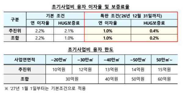 융자 한도는 사업 면적에 따라 다르다. 면적 20만㎡까지는 추진위는 10억원, 조합은 10억원을 대출받을 수 있다. 50만㎡를 넘어가는 사업장의 경우 추진위는 15억원, 조합은 60억원까지 가능하다.