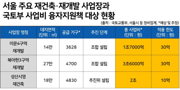 서울 동대문구 이문휘경뉴타운 마지막 퍼즐로 불리는 이문4구역. 지하5층~최고 40층, 20개 동, 3720가구 대단지로 공급 효과가 클 것으로 기대되는 곳이지만, 혜택을 누리기 어렵다. 대지면적 15만㎡로, 지원액이 가장 낮은 구간(20만㎡ 이하)에 속해 최고 30억원을 빌릴 수 있다. 총 사업비 1조7000억원의 1.76% 수준이다.