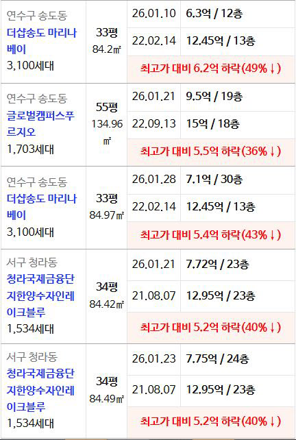 국토교통부 실거래가공개시스템에 따르면 ‘더샵송도마리나베이’ 전용 84㎡은 지난 달 6억3000만원(12층)에 거래됐다. 한 달 전 같은 층이 7억1500만원에 팔리면서 반등 기대감이 나왔으나, 이보다 8000만원 떨어진 가격에 거래가 성사됐다. 이는 2022년 2월 기록인 최고가 12억4500만의 절반 수준이다.