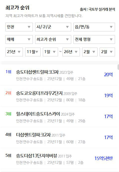 [땅집고] 강력한 부동산 대책 여파로 혼돈이 이어지는 수도권 부동산 시장에서 수개월째 잠잠한 곳이 있어 눈길을 끈다. 바로 ‘인천의 강남’ 송도신도시다. 일부 단지의 경우 최고가의 절반 수준에 팔리고 있다. 이재명 대통령이 연일 아파트 가격 안정을 목표로 고강도 발언을 이어갈 정도로 나날이 신고가를 기록하는 서울과 달리, 송도 아파트 가격은 반등할 가능성이 낮다는 평가다.