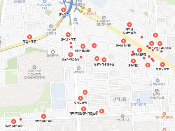 그러나 단지를 벗어나는 순간 유흥업소 간판을 쉽게 볼 수 있다. 단지 북측에 위치한 간석오거리 상권은 인천 대표 유흥업소 밀집 지역 중 하나다. 이 단지의 경우 대로변에 접한 아파트 서측을 제외하면 모텔과 주점, 노래연습장이 펼쳐진다. 단지에서 간석오거리역방면 반경 600m 이내는 모텔 20여개가 있다. 노래연습장과 주점의 수는 이보다 배로 많다.