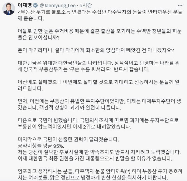 [땅집고] 이재명 대통령이 돌연 부동산 시장을 향해 날 선 메시지를 쏟아내고 있다. 지난 1월 31일부터 엑스(X·옛 트위터)를 통해 올린 부동산 관련 게시물만 벌써 8차례다. 투기세력과의 전쟁을 선포하며 고강도 세제 카드까지 만지작거리는 모양새다. 대통령은 이날 다주택자 세제 강화 반대론에 대해 “돈이 마귀라더니, 설마 마귀에게 최소한의 양심마저 빼앗긴 건 아니겠죠”, “부동산 투기 때문에 나라 망하는 걸 보고도 왜 투기편을 들까”라는 등의 글을 올리기도 했다.