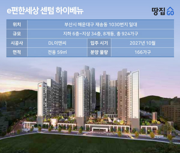 ‘e편한세상 센텀 하이베뉴’는 재송2구역을 재건축해 지하 6층~지상 34층, 8개동, 총 924가구로 짓는 아파트다. 이 중 일반분양 물량이 166가구며 주택형은 모두 59㎡다. 이달 9일 특별공급, 10일 1순위 청약을 각각 받는다. 입주일은 2027년 10월로 예정됐다. 시공은 DL이앤씨가 맡는다.