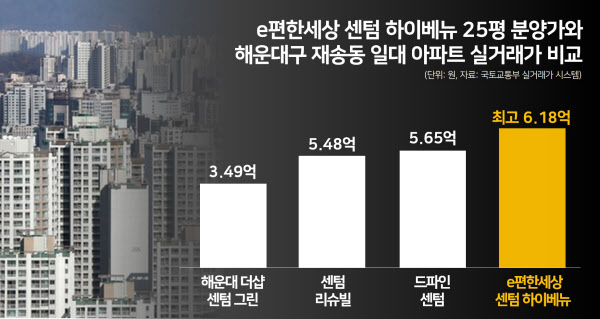 분양가만 놓고 보자면 인근 아파트 시세와 비교했을 때 저렴한 편은 아니다. 59㎡ 기준으로 단지 바로 북쪽에 있는 ‘해운대 더샵 센텀그린’(464가구·2019년)이 지난해 12월 3억4900만원(20층)에 팔린 것과 비교하면 ‘e편한세상 센텀 하이베뉴’가 1억5000만원 정도 비싼 것. 같은 재송동에 ‘드파인센텀’(750가구·2024년)이 지난해 5월 5억6500만원(20층) ‘센텀리슈빌’(753가구·2019년) 올해 1월 5억4800만원(15층)에 각각 거래된 것 보다는 5000만원 이상 높은 분양가다.