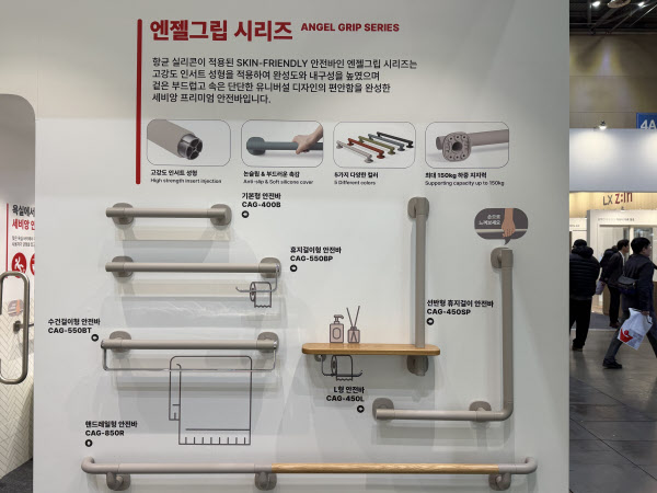 안전바 라인업도 한층 강화됐다. 지난해 출시한 ‘엔젤그립’ 시리즈에는 핸드레일형 제품이 새롭게 추가됐고, 디자인을 더욱 세련되게 개선한 ‘엔바그립’ 시리즈도 함께 공개됐다. 이와 함께 샤워부스형, 욕조 진출입형 등 용도별 다양한 형태의 안전바도 선보였다.