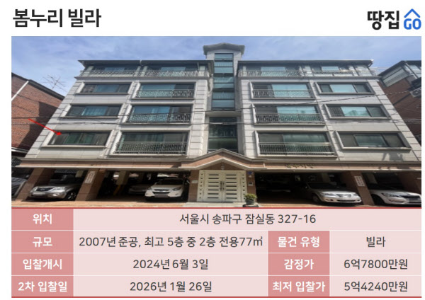 땅집고옥션(▶바로가기)에 따르면 해당 물건은 서울 송파구 잠실동 ‘봄누리’ 빌라 2층, 전용면적 77㎡(23.3평)로 2024년 6월 첫 경매에 나왔다. 사건번호는 2023타경54782. 최초 감정가는 6억7800만원이었지만 1회 유찰 후 변경 절차를 거쳐 올 1월 다시 경매에 나온 것. 최저 입찰가는 5억4240만원이었는데 103명이 응찰했고 이 중 A씨가 9억1333만원을 써내 낙찰받았다.