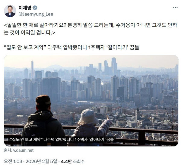 A씨는 “이재명 대통령 말 대로라면 대통령도 계양 갔을 때 팔아야지”라면서 “거의 모든 1주택자가 같은 사연일 듯 하다. 사연 없는 사람이 어디 있느냐, 잘 살고 있는 국민 그만 괴롭혀라”라고 했다.