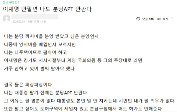 현재 경기 성남시 분당 까치마을아파트에 살고 있다고 밝힌 글쓴이 A씨는 “이재명 대통령이 1주택자도 실거주 안하면 매도하라는데, 그의 주장대로라면 이재명도 경기도지사 시절부터 계양 국회의원 등 시기에 (분당 양지마을 아파트에) 실거주를 하지 않고 있었기 때문에 벌써 팔아야 했던 것 아니냐”면서 “대통령도 본인 말 안지키는데 시민인 내가 팔 의무가 없다”고 강하게 지적했다.
