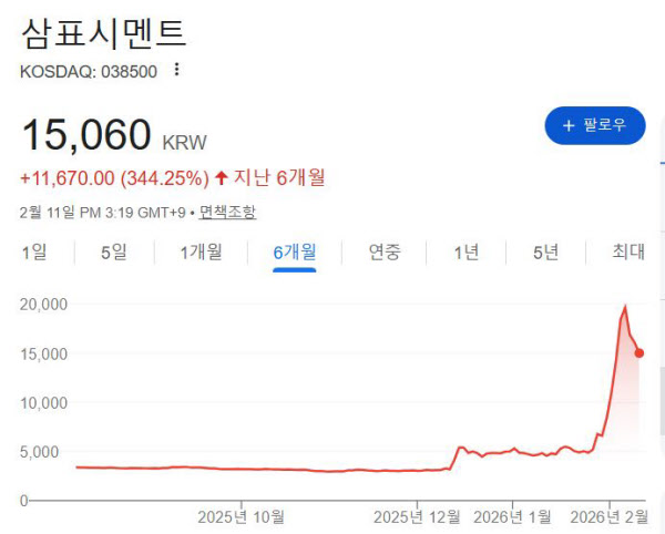 주목할 점은 실적 흐름과 정반대로 움직이는 주가다. 실적 악화 지표가 뚜렷함에도 불구하고, 삼표시멘트의 주가는 최근 3개월 사이 2800원대에서 1만5060원(2월 11일 종가 기준)까지 치솟았다. 석 달 만에 400% 급등한 수준이다. 52주 최고가인 2만3500원에 비하면 다소 하락했으나, 펀더멘털(기초체력)과는 극심한 괴리를 보이고 있다. 서울 성동구 성수동 옛 삼표레미콘 부지 개발이 착공을 앞두고 이에 대한 기대감이 삼표시멘트 주가를 연일 끌어올리고 있다.