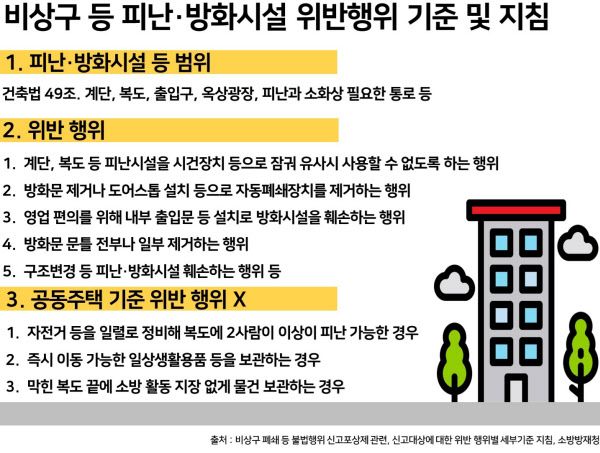 소방방재청은 ‘비상구 폐쇄 등 신고 대상에 대한 위반행위별 세부기준 지침’을 통해 사실상 적치물이 피난 공간을 막아 ‘폐쇄했다’고 판단할 경우 위반 행위로 간주한다고 했다. 구체적으로 △피난·방화시설을 폐쇄하는 행위 △방범창을 달아 잠그는 행위 △개방이 불가능하도록 하는 행위 등이다.
