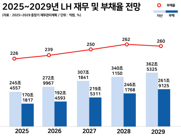 LH는 임대주택으로 매년 2조원 이상 손실을 누적 중이다. 이 대통령이 주문한 아파트 시행 사업까지 떠맡을 경우 손실액 증가가 불가피하다. LH 부채 총계는 2021년 138조원에서 2025년 170조원으로 4년 간 23% 증가했다. 2029년에는 362조원에 이를 전망이다.