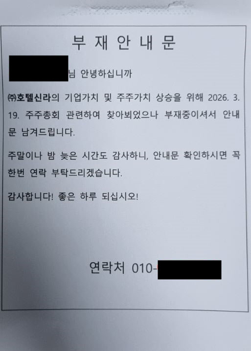 최근 호텔신라 소액주주들 사이에서 의결권 대행사를 통한 자택 방문 위임장 요청에 대한 불만이 잇따르고 있다. 주주 A씨는 “일요일에 갑자기 자택 벨을 눌러서 호텔신라 위임장을 달라고 하더라”며 “내 이름과 주식 보유 사실까지 알고 있는 게 당황스러웠다”고 전했다. 주주 B씨 역시 “부모님과 함께 사는 집에 불쑥 찾아와 노부모님이 피싱 사기인 줄 알고 겁을 먹으셨다”며 “주주 명부에 기재된 정보를 바탕으로 한 절차라지만, 요즘 세상에 사전 통지도 없는 방문은 삼성답지 않은 구태”라고 비판했다.