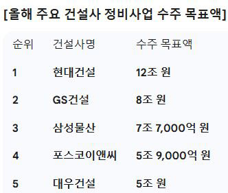 이처럼 ‘탑티어(Top-Tier·일류)’ 건설사들이 서로의 영역을 침범하지 않고 알짜 사업지를 사실상 ‘나눠먹기’ 하며 출혈 경쟁을 피하고 있는 셈이다. 올해 현대건설의 정비사업 목표 수주액은 총 12조원이다. 그 다음으로 GS건설 8조원, 삼성물산이 7조7000억원으로 뒤를 잇는다. 포스코이앤씨와 대우건설은 5조원 대다.