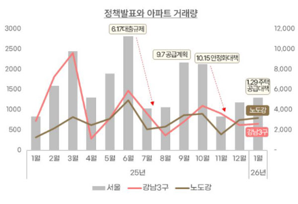 최근 서울 아파트 거래 구조를 보면 정책 변화에 따른 단기 변동성이 두드러지게 나타나고 있다. 규제가 강화될 때마다 거래량이 급감했다가 소폭 상승하는 패턴이 반복되고 있으며, 특히 강남 3구를 중심으로 정책 변수에 민감하게 반응하는 흐름이 지속되고 있다.