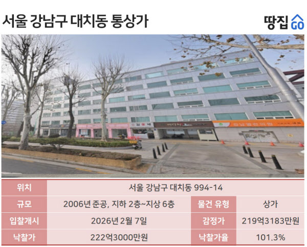 [땅집고옥션] 은마아파트 바로 옆 대치동 상가, 경매서 222억에 낙찰