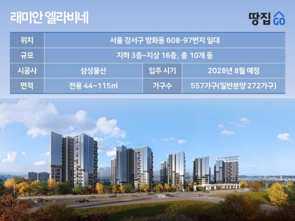 래미안 엘라비네는 방화6구역 재건축 사업으로 서울 강서구 방화동 608-97번지 일대에 들어선다. 지하 3층~지상 최고 16층, 10개동 총 557가구 규모다. 이 가운데 272가구가 일반분양 물량이다. 입주는 2028년 8월 예정이다. 일반분양 물량의 대부분은 중형 평형이다. 전용면적 84㎡가 178가구로 전체 일반분양의 약 65%를 차지한다. 실수요자 선호도가 높은 주택형 중심으로 구성했다.