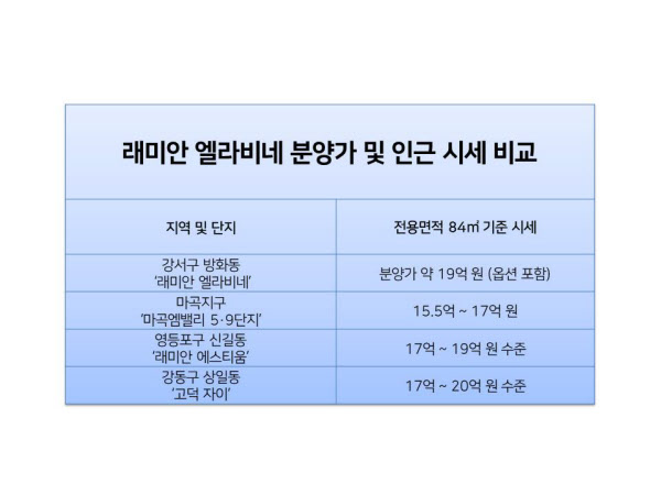 주변 시세와 비교해도 부담이 크다는 평가가 나온다. 인근 마곡지구 ‘마곡엠밸리 5단지’와 ‘마곡엠밸리 9단지’ 전용 84㎡는 최근 15억원대 중반에서 17억원 수준에 거래됐다. 래미안 엘라비네 분양가가 인근 마곡 아파트 시세보다 높은 셈이다.