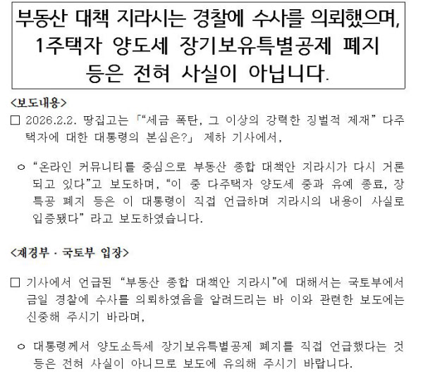 본지는 지난 2월 정부가 양도소득세 장기보유특별공제 제도를 손질할 가능성이 있다는 취지의 보도를 한 바 있다. 당시 국토교통부와 재정경제부는 “1주택자 장기보유특별공제 폐지는 전혀 사실이 아니다”라며 공식 해명자료를 내고 관련 가능성을 강하게 부인했다. 그러나 이번에 김 장관이 장기보유특별공제를 직접 언급하며 “전체적으로 세제를 손질해야 한다”고 밝히면서, 정면 부인했던 해명 자료가 불과 한 달여 만에 무색해졌다.