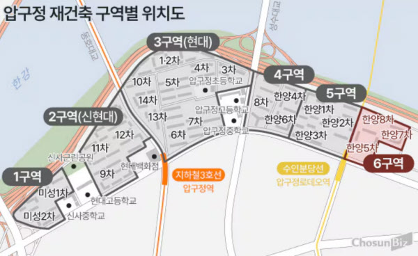 이 단지는 현재 압구정3구역으로 묶여 재건축 사업을 추진하고 있다. 총 6개 구역으로 나뉘는 압구정 재건축 현장 중 규모가 가장 크고 입지가 좋다는 평가다. 앞으로 재건축을 통해 최고 65층, 30개동, 총 5175가구 대단지로 탈바꿈할 예정이다. 오는 5월 시공사 선정을 위한 총회를 앞두고 있는 가운데 공식적으로 출사표를 던진 업체는 현대건설이 유일하다. 통상 대형건설사가 서울 핵심 정비사업지마다 하이엔드 브랜드를 적용하지만, 압구정현대의 경우 고유의 이름 가치를 고려해 재건축 후 단지명으로 ‘디에이치’ 대신 ‘압구정현대’를 유지할 것이라는 전망이 나온다.