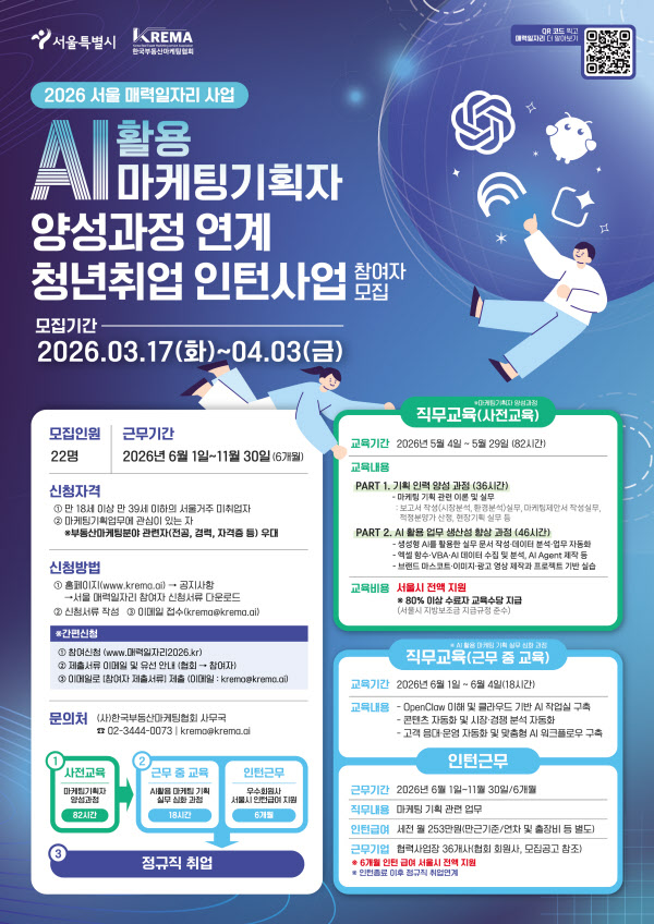 올해 사업의 가장 큰 특징은 교육 과정의 고도화다. 협회는 기존 40시간이었던 AI(인공지능) 관련 커리큘럼을 ‘AI를 활용한 마케팅기획 전문가 양성과정’으로 개편하고 교육 시간을 100시간으로 대폭 확대했다. 생성형 AI 도구 및 업무 자동화 툴 활용, 데이터 분석과 AI 기반 마케팅 전략 기획 등 기업 현장에서 즉시 활용 가능한 심화 커리큘럼을 마련해 인턴들이 단순 보조 업무를 넘어 AI 기술을 실무에 적용할 수 있는 핵심 인재로 거듭날 수 있도록 지원할 방침이다.
